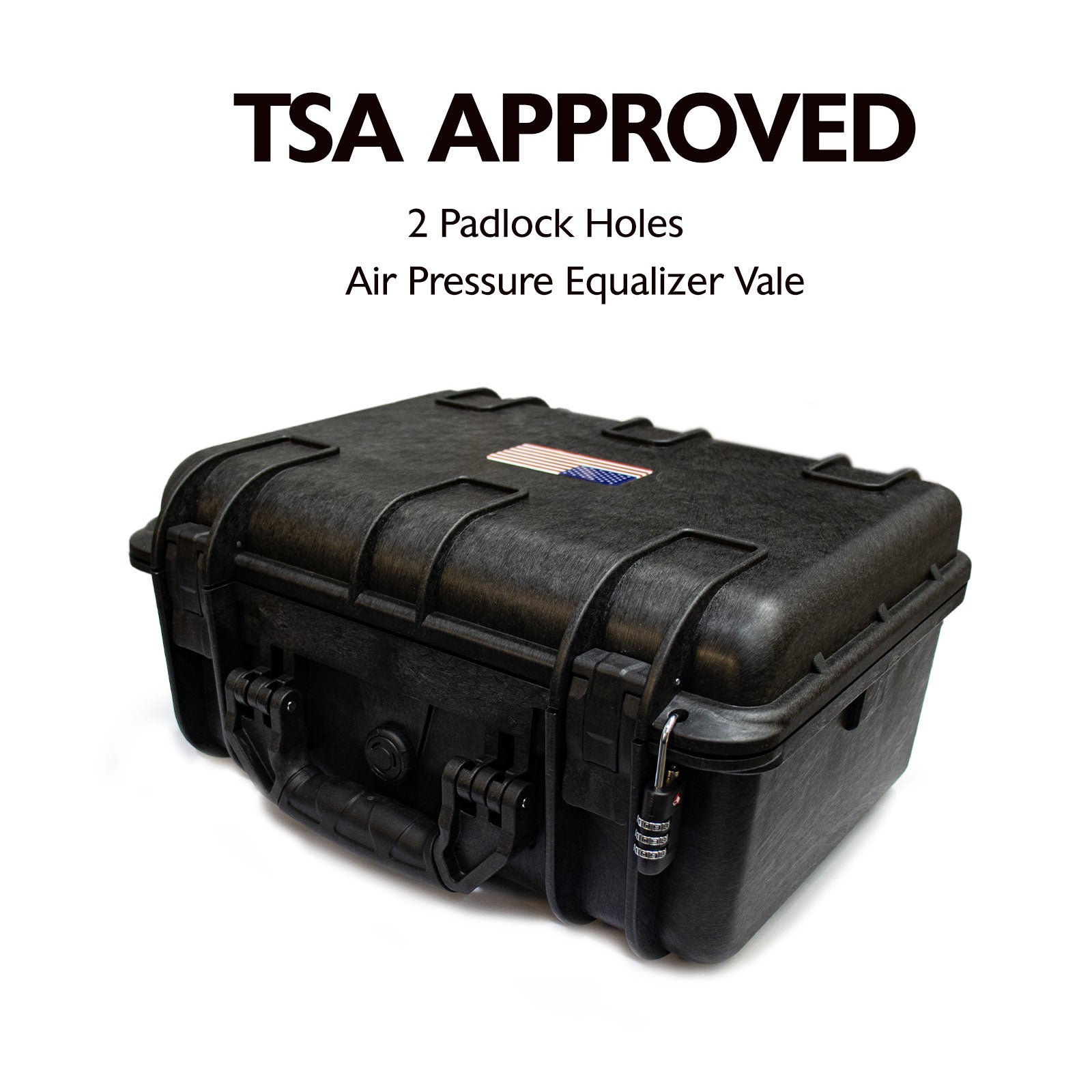 - Classic Design: Features two latches, two lock holes (0.29" diameter), a rubberized handle, an O-ring seal, and a valve for pressure equalization. These design elements ensure convenient and reliable usage, while the valve balances internal pressure, preventing water ingress. The 2 padlock holds enable TSA transport compliant.